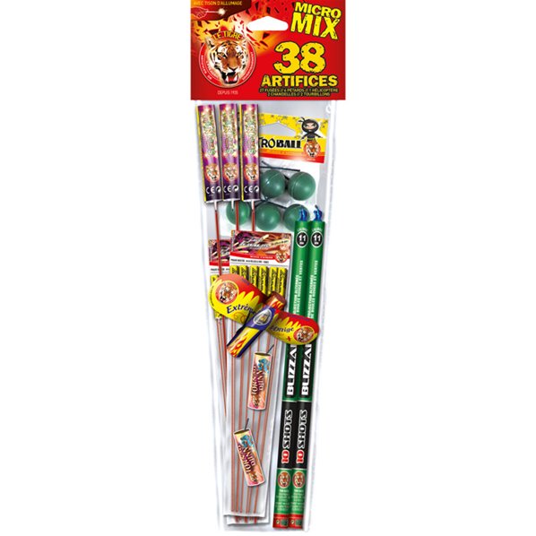 Assortiment micro mix de 36 artifices. Indispensable ! Assortiment de 38 petits artifices ludiques avec chandelles, fusées, boules crépitantes et tourbillons volants : un BEST OF de la collection Le Tigre®.