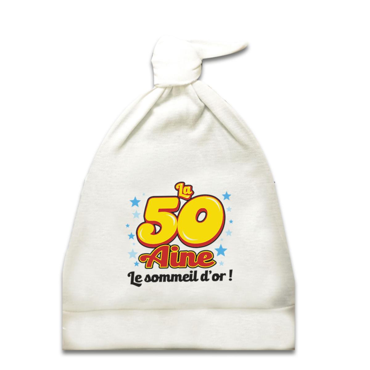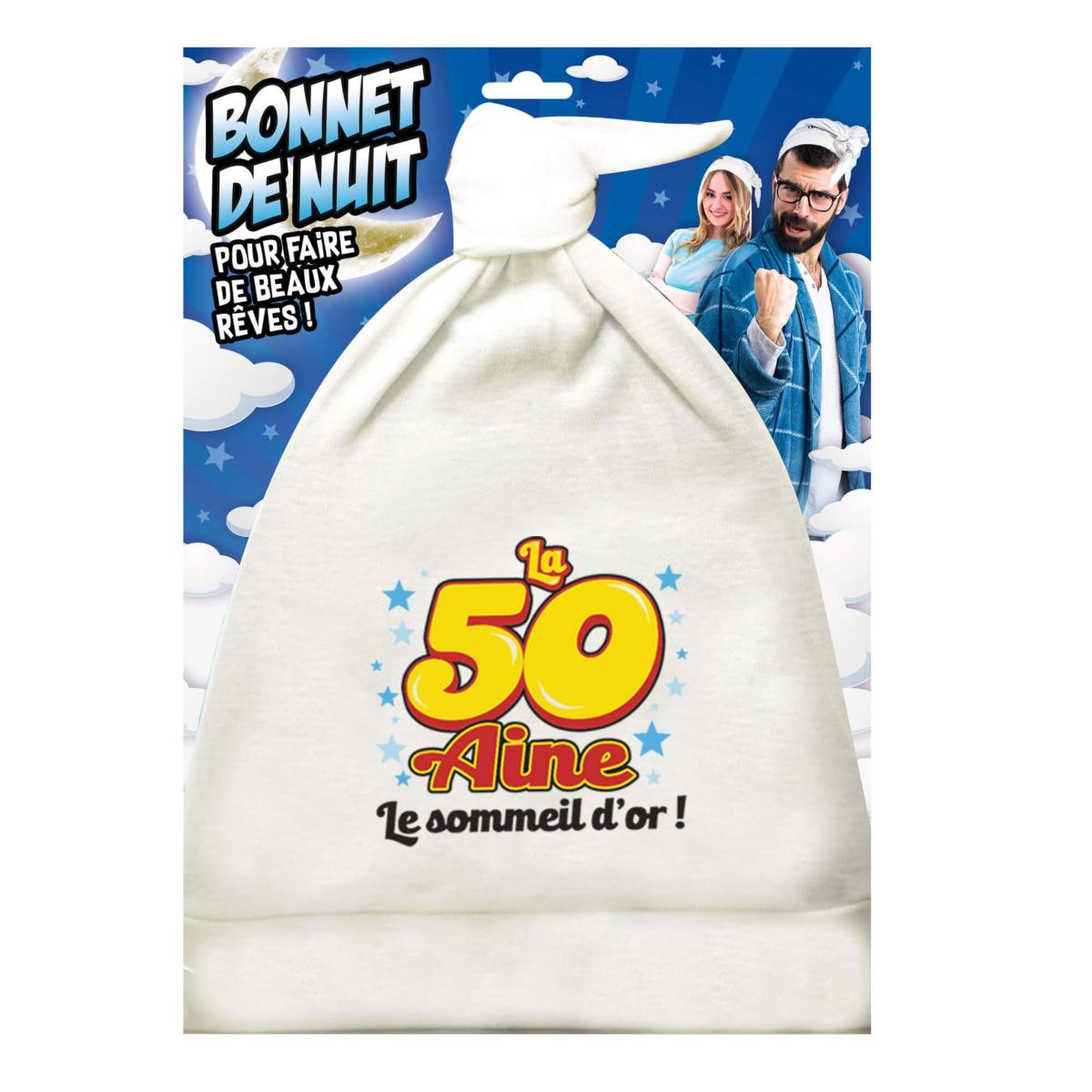 Ce bonnet de nuit spécial 50 aine, rehaussé d’un nœud, est le cadeau parfait pour un anniversaire insolite... 100% coton, ce bonnet unisexe va mettre en valeur son destinataire pour faire de beaux rêves ! Voilà un cadeau original et humoristique.