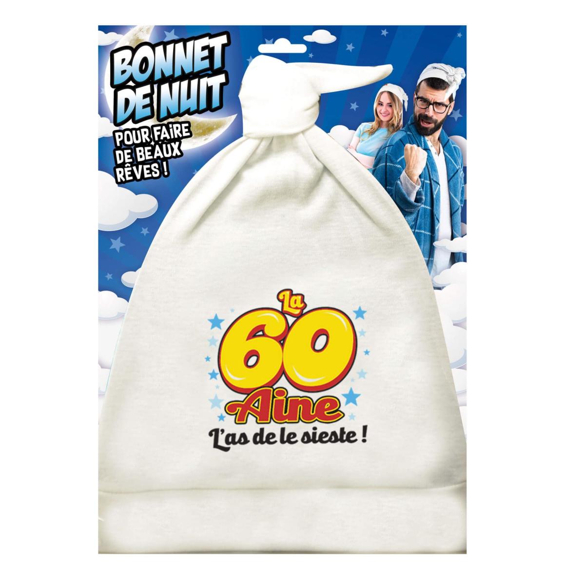 Ce bonnet de nuit spécial 60 aine, rehaussé d’un nœud, est le cadeau parfait pour un anniversaire insolite... 100% coton, ce bonnet unisexe va mettre en valeur son destinataire pour faire de beaux rêves ! Voilà un cadeau original et humoristique.