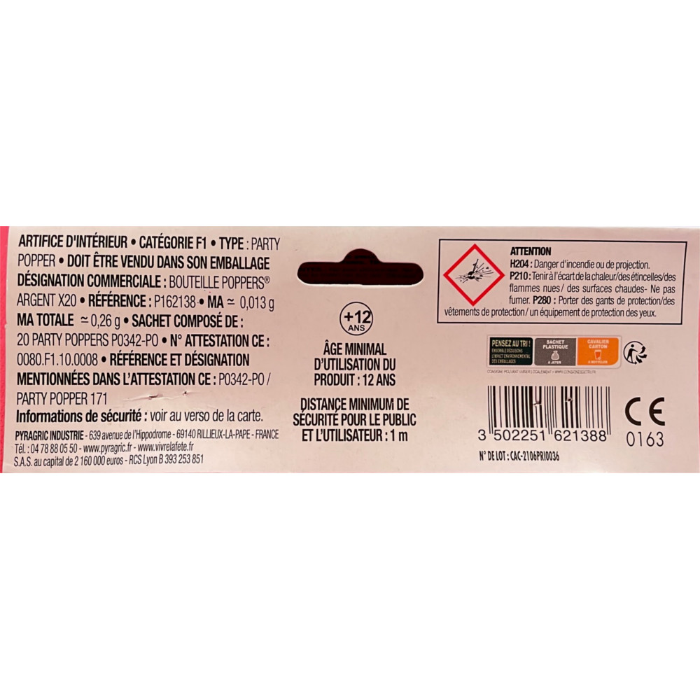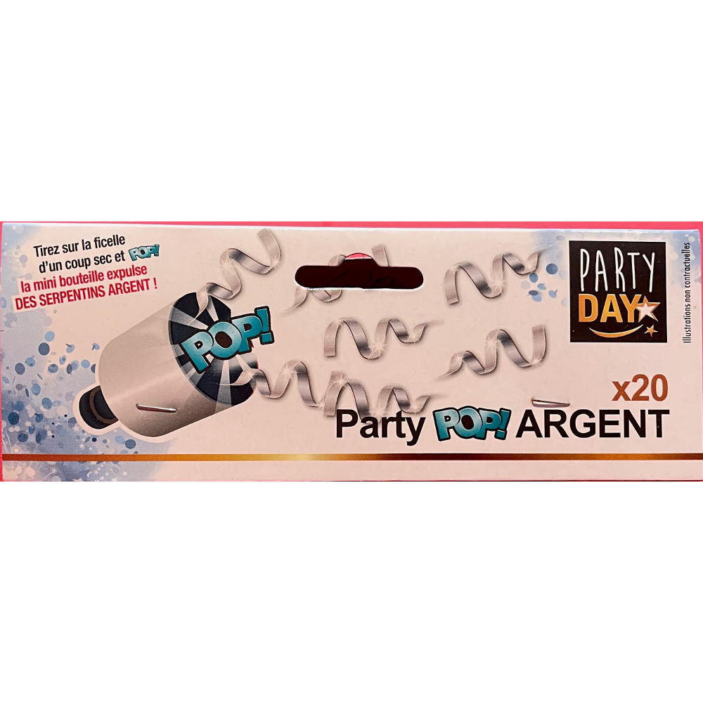 Tirez sur la ficelle d'un coup sec et la mini-bouteille expulse des serpentins argent.