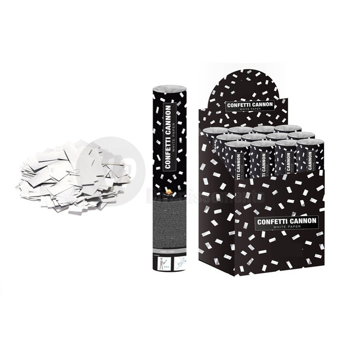 Canon bombe popper confettis rectangulaires papier métallisé ARGENT à déclenchement manuel. Grammage papier économique 20 grammes environ. Couleur canon NOIRE pour plus d'élégance. Projette les confettis en l'air, portée jusqu'à 6 mètres environ. Il faut pivoter la partie basse du tube pour déclencher l'explosion. Longueur du tube 40cm environ.