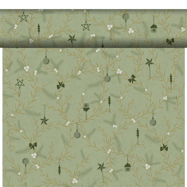 Chemin de table effet tissu Dunicel Pistachio Noël. Prédécoupé tous les 1,20 mètres pour faire des tête à tête. Longeur totale : 24 mètres.