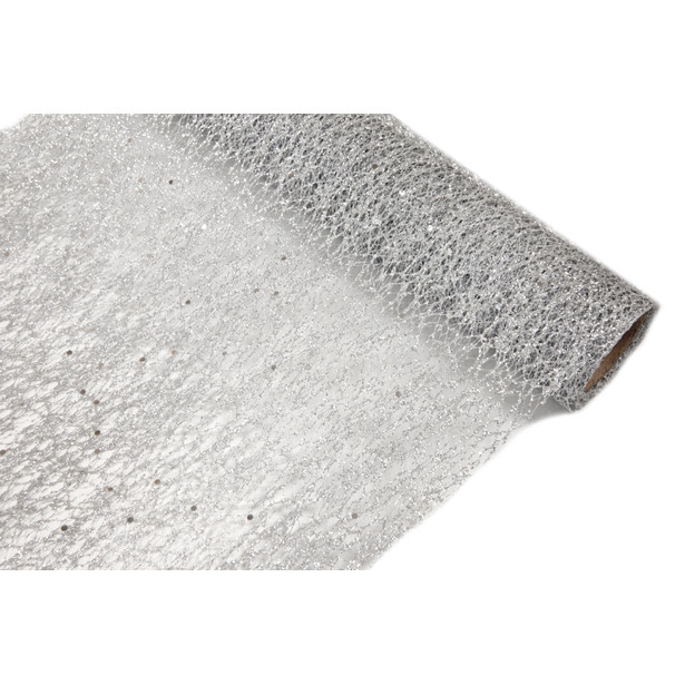 Ce superbe chemin tout en en brillance est pailleté argent avec des sequins également argentés. C'est un filet laissant apparaître votre nappe en-dessous.