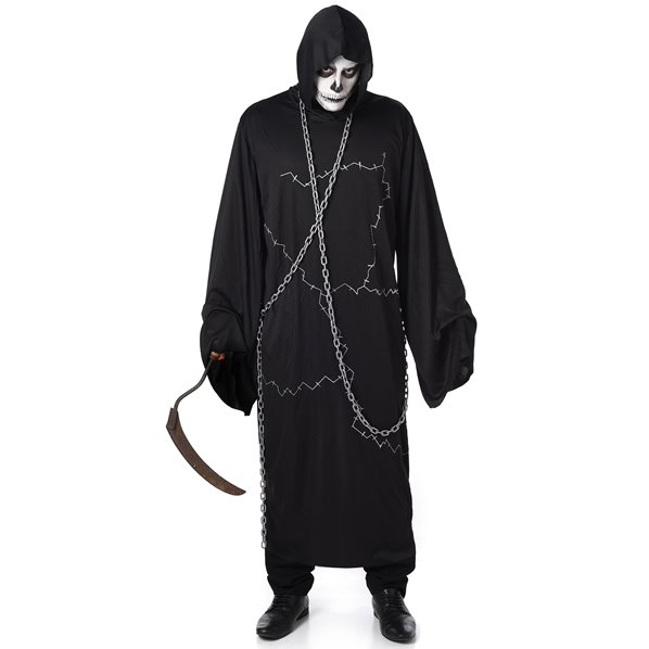 Ce costume de faucheur en taille L (42/44) comprend la tunique noire et les chaînes en plastique. 100% polyester.