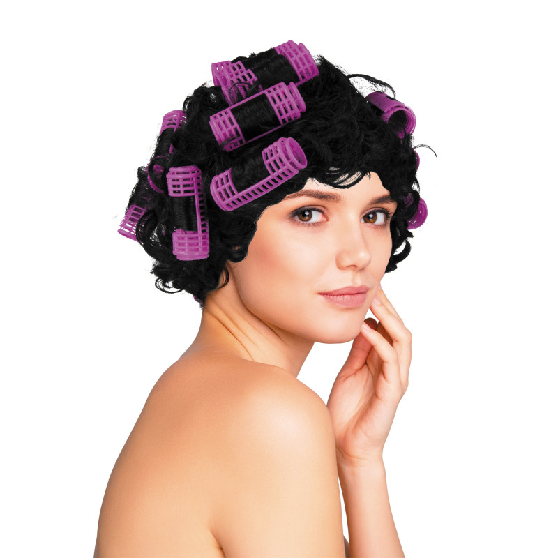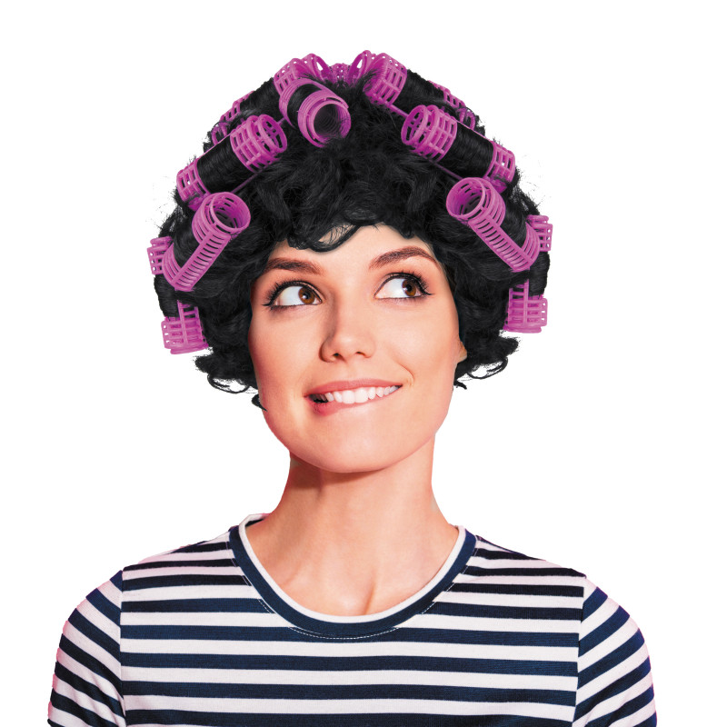 Cette perruque noire avec des bigoudis roses vous permet, en deux temps trois mouvements, de vous faire un petit look ménagère juste parfait pour une soirée Deschiens ou Vamps.