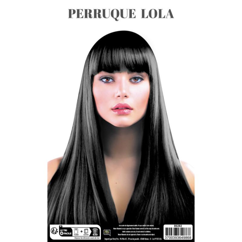 Cette perruque Lola est noire avec une frange. Sa longueur est d'environ 60 cm. Un filet en élastique équipe cette perruque pour convenir à tous les tours de tête. 100% polyester, son poids est d'environ 180 grammes. Elle vous sera livrée dans une boîte en plastique transparente.